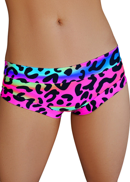 Sexy scrunch butt hot pants with wide crotch designed for pole dancers. Made with matte neon rainbow leopard fabric with signature Cleo Lightning Bolt label.